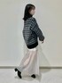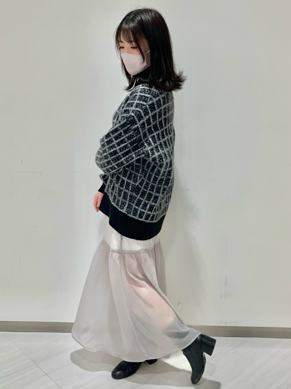 156cm 骨格ウェーブ 足のサイズ 23.5(幅広め) 【cardigan】 ツイードロングカーデ ブラック系 / フリーサイズ 袖口と裾は割とフィットします そのため見た目は軽いですが かなり暖かいです!!! 素材の毛足は長くないのでこの上から アウターを羽織るのも可能です。 腰回りをカバーしてくれるので 産後の骨盤もしっかり隠してくれます♡♡ 冬はトップスとして、春は更に カーディガンとしてたくさん着回しが 出来るアイテムです♡ 【tops】 刺繍ハイネック (指穴があるタイプです) ブラック / フリーサイズ テレコ生地なのでハイネックさが しっかり出て可愛いです♡ 厚みがそこまで無いので スウェットの中やワンピースなど 重ね着がしやすいです! 【bottom】 シアーマーメイドスカート グレー / フリーサイズ サイドファスナーになり 後ろはゴムになります。 薄手なのでボリュームのあるニットやアウターに合わせると冬から春先でも着回しがしやすいです♡ 【shoes】 ストレッチブーツ ブラック / Mサイズ ヒールが苦手な方でも履きやすいチャンキーヒールです。 24.0寄りの方はLサイズがオススメです。 薄手の靴下まででMサイズであれば 私の足のサイズでジャストでした!
