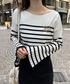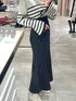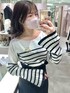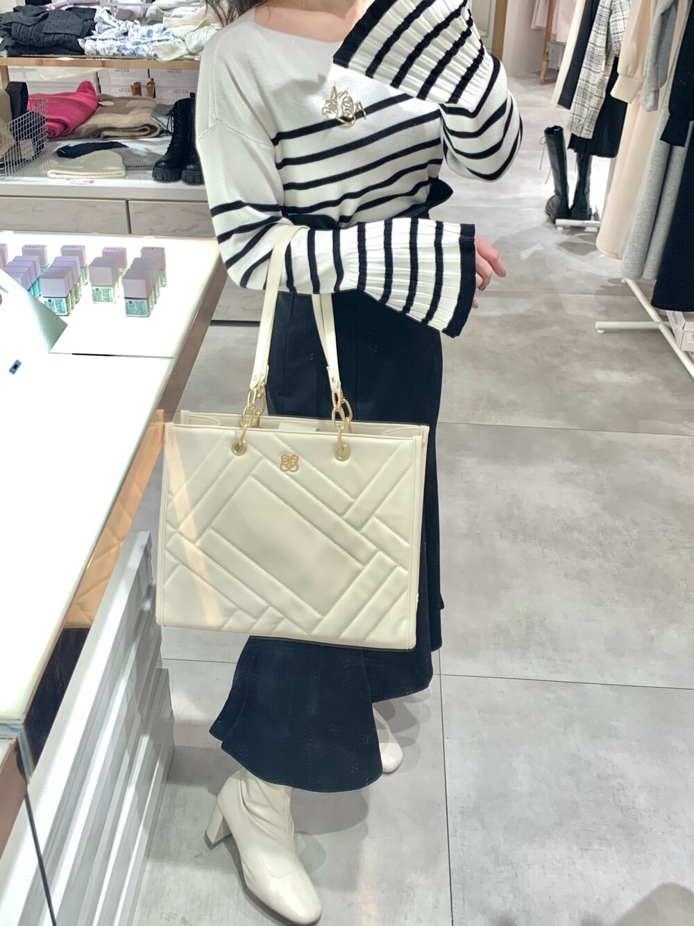 156cm 骨格ウェーブ 足のサイズ 23.5(幅広め) 【tops】 ブローチ付きベルスリーブニット 黒ボーダー / フリーサイズ ニット素材はかなり薄手なので初夏あたりまで着られるようになっております! デコルテラインが見えるくらいスッキリしているのでポニーテールなどのまとめ髪をするのもオススメします♡ 袖口は少し長めなので手がコンプレックスの私は隠してもらえて凄く助かります!! 【bottom】 ハイウエストマーメイドスカート ブラック / Sサイズ 【bag】 キルティングトートバッグ アイボリー オリジナルのキルティング柄です♡ 見た目は重そうですが、とても軽く柔らかい素材感なので肩掛けしても痛くありません! A4サイズが入りマチもしっかりあるのでお弁当やタンブラーなどを入れたりノートパソコンを入れたい方オススメです♡