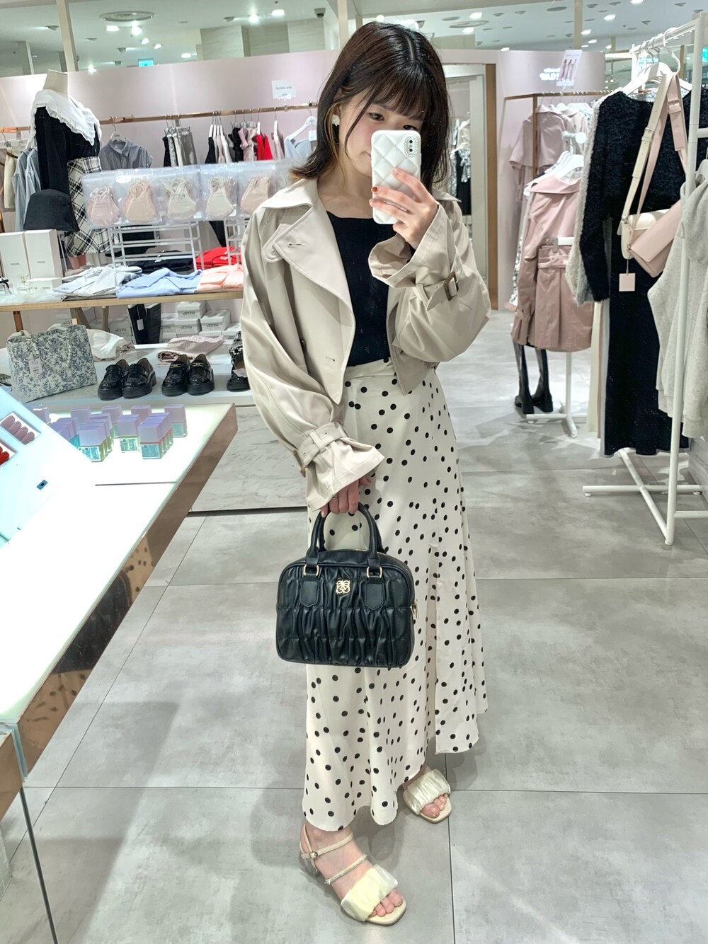156cm 骨格ウェーブ 足のサイズ 23.5(幅広め) 【outer】 マルチwayトレンチコート マルチwayトレンチコート ベージュ / Mサイズ 全て繋げた長さは足首が絶対出るので もっとロングが好き!という方は Lサイズをオススメします! ショート丈のトレンチ、 ジレとしても使えて 襟はスタンド襟でハイネックに! 名前の通りマルチwayです⭐︎ そのため3月から6月ごろまで 長くお使い頂けるアイテムです。 【tops】 ブローチ付きベルスリーブニット ブラック / フリーサイズ ニット素材はかなり薄手なので初夏あたりまで着られるようになっております! デコルテラインが見えるくらいスッキリしているのでポニーテールなどのまとめ髪をするのもオススメします♡ 袖口は少し長めなので手がコンプレックスの私は隠してもらえて凄く助かります!! 【bottom】 色っぽマーメイドスカート ドット / Sサイズ 後ろリボンに出来る紐は縫い付けてあります。 そのため紛失を防げますし ブラウス生地からニットまで 幅広くコーディネートしやすいです♡ 右足側に膝までのスリットがありますので 歩行しやすいです! 私の身長ではSサイズでペタンコでも 履けますがMサイズは2〜3cmある 厚底やヒールと履くことをオススメします。 【shoes】 ダブルベルトラインストーンサンダル アイボリー / Mサイズ 普段の私のサイズならLサイズがほとんどなのですが、このサンダルならMサイズがピッタリでした! 足首部分の紐は引っかけるタイプなので破損する心配無用です! シンプルめな作りなので色々なアイテムに合わせやすいデザインなのでデニムと履いていただくのもオススメです♡ ヒールはかなり低いのとキルティング素材で歩きやすさ抜群に良いです! 【bag】 Seemi シャーリングバッグ / ブラック ショルダーにも出来る紐付きです! マチもしっかりあるので小さすぎないので割と量は入ります! 350mlくらいの水筒や小さめの折り畳み傘なら入るかと思います。 モバイルバッテリーなど入れておきたい方にもオススメです♡