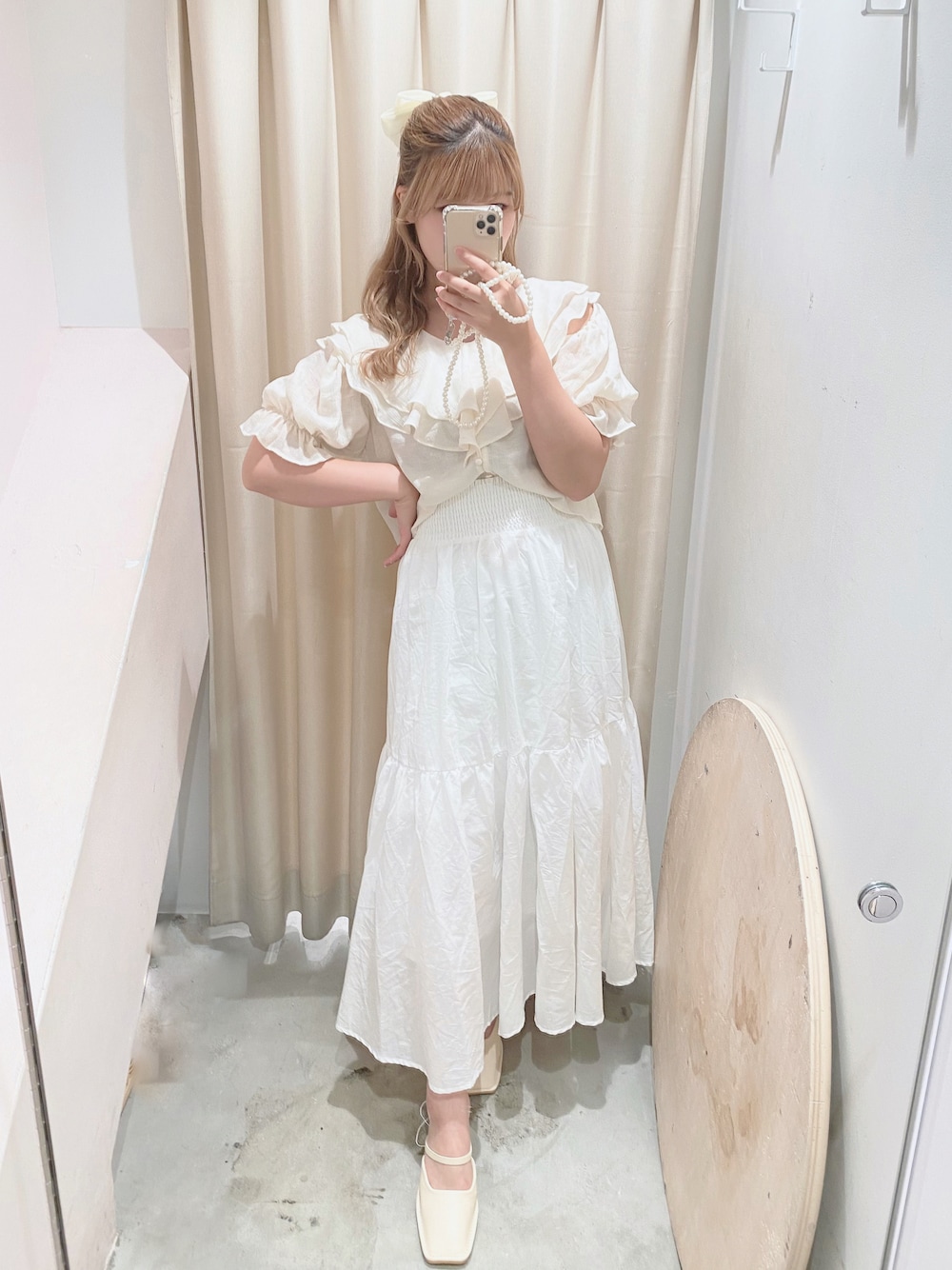 【身長】155cm 【足のサイズ】23.5cm 【パーソナルカラー】イエベ秋 【骨格】ストレート ご覧いただきありがとうございます❤︎ 【tops】フレアフリル羽織ブラウス サイズ展開:フリー ・ 今年トレンドの肩あきの羽織ブラウスです❤︎ 肩あきは肩の紐で調節できるので肩あきが苦手な方は私のように閉じても着て頂けます◎ とっても軽い素材なので真夏に着ていただいても涼しく着れると思います! 名前の通りボタンを開ければ羽織にもなるので、中にキャミソールを合わせて羽織ったりもできます◎ フリルもとろんとした生地なので肩幅が広く見えることなく可愛く着ていただけます❤︎ 【skirt】コットンレーススカート サイズ展開:フリー ・ 夏にぴったりの優しいコットン素材のフレアスカートです❤︎ ウエスト周りは全てゴムになっているので、とっても着ていて楽ちんでした! そしてウエストマークが太めに入っているので嬉しい細見え効果も◎ 生地をたっぷり使っているので立体感のあるふんわりとした形になります❤︎ きれいめにもカジュアルにも合わせやすい1枚です! 【shoes】ストラップ付きミュールサンダル サイズ展開: S/M/L ・ 私はMサイズを着用しております! ストラップが付いているため脱げにくく、すごく安定感があり、中にしっかりクッションが入っているので疲れにくいのが印象でした! ストラップのところにはゴムが入っているので着脱も楽ちんです! ヒールは5cmとほどよく盛れる高さなのが嬉しいですね❤︎ どんなコーディネイトにも合わせやすいシンプルなサンダルです!