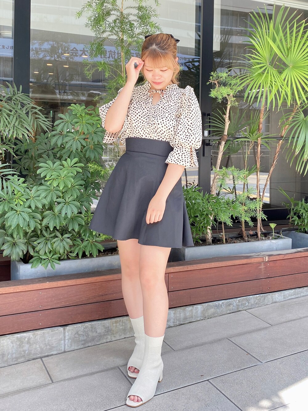 【身長】155cm 【足のサイズ】23.5cm 【パーソナルカラー】イエベ秋 【骨格】ストレート ご覧いただきありがとうございます❤︎ 【tops】前後2wayリボンブラウス サイズ展開:フリー ・ 見た目も形も可愛い最強ブラウスが登場しました❤︎ 名前の通り前後2wayで着ることができます! 私は首元をすっきりと見せたいのでVネックになっている方を前で着てみました◎ 袖は腕の関節あたりまであるので二の腕をしっかり隠してくれるのも嬉しいポイントです! ダルメシアン柄はサラッとしている素材なので着心地も良かったです! 【skirt】バックレールアップフレアミニスカート サイズ展開:フリー ・ とてもシルエットがキレイなスカート❤︎ 後はレースアップになっていて締めることも緩めることもでき、ご自身のウエストに合わせて調節することができます◎ 素材も高級感があるような柔らかい素材なので高見えすること間違いなし◎ ブラウスに合わせていただくと大人可愛く仕上がります❤︎ 【shoes】ニットブーツサンダル サイズ展開:S/M/L ・ 私はMサイズを着用しております! ファスナーがないタイプのサンダルですが、伸び感のあるニットなので着脱も簡単でちょうどよかったです◎ ヒールは5cmなので程よく盛れ、とっても歩きやすいのが印象でした! ニット素材なので今の季節はもちろん、秋口まで長く履いていただけるデザインとなっております❤︎