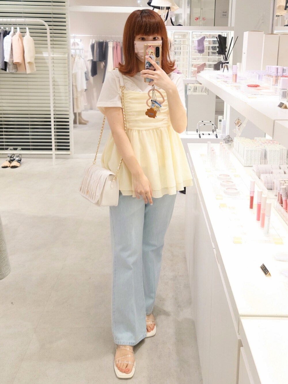 ●骨格ウェーブ ●イエベ春×ブルベ夏のmix ●足:22.5cm(普段はSサイズ)、内反小趾 【Tシャツ】size:free col:アイボリー 大きすぎず、小さすぎずなTシャツなので1枚でさらっと着れます◎ 着丈も長すぎないのでインしても、もたつかず着れるのも嬉しいポイントです! カジュアルになりがちなTシャツもハートのワンポイントでおしゃれに可愛く着て頂けます♡ 【ビスチェ】size:free col:イエロー 今季のトレンドで1枚あるだけでおしゃれの幅が広がります◎ 肩ひもで長さも調節できるので小柄の私でも大丈夫でした! 胸元もぴったりめの作りなので骨格ウェーブの私でもゆるくなく、また胸下で切り替えにもなるので脚長効果もバッチリでした◎ 少し透け感があるのが夏っぽくて可愛いです♡ 【デニム】size:S着用 col:サックスブルー 152cmでSを着用してくるぶしぐらいの丈感です! なので靴を履けばヒールでなくてもギリいけるかな?といった感じです◎ 最近ナイスから出てるデニムと比べると全体的にゆるっとしてますが太ももは少しピタッとしやすいので骨格ウェーブの私でもきれいに見えました! 骨格ウェーブの私はウエストが少し大きかったので(指3本は余裕で入るぐらい)、骨格ウェーブなどウエスト細めの方はベルトでとめるなどをおすすめします◎ 普段パンツはおしりがピタッとして大きく見えがちな私ですがこれはあまり気にならず着やすく感じました! 【バッグ】 col:アイボリー 肩ひものベルトで長さを自由に調節できるので小柄の私でも肩ひもが長くなく、使いやすかったです◎ 折りたたみ財布入れて半分もは埋まらないかな?といった大きさです! クシュクシュ感が高級見えもするので普段使いはもちろんですがオケージョンの時も使えたりと幅が広がります! 【サンダル】size:M着用 col:アイボリー 22.5cmでMを着用してますが少し大きめだった為ジャストサイズでよさそうです◎ ヒールがほぼないので扁平足の私は少し足裏が痛く感じましたが普段スニーカーやペタンコの靴が多い方なら大丈夫そうです! かかと側にもストラップがついているので脱げやすいとかはなさそうです!