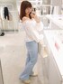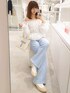 【ブラウス】size:free col:オフホワイト オフショルでも着れるブラウスでウエスト丈なのでインしなくてもきれいに着れました◎ 内側に折り込んでお腹をチラ見せして着るのも韓国っぽくて可愛いのでおすすめ♡ 肩幅が狭いかつなで肩なのでオフショルになるブラウスって、落ちやすいんですがこれは意外と大丈夫でした! 【デニム】size:S着用 col:ライトブルー 152cmの私はSサイズを履いてます! 丈は少し長いですが少しヒールのある靴と合わせれば問題なさそう🙆♀ 骨格ウェーブでデニムのシルエット似合わないこと多いんですが、これは骨盤も目立たずきれいに着れました♡ 最近の中で1番おすすめのデニムです!