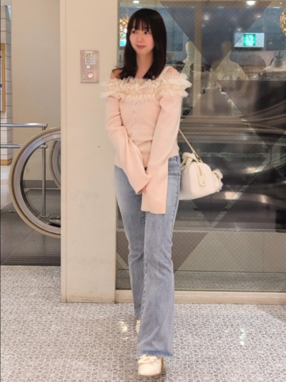 ばら(one after another NICE CLAUP)のニット/セーター「【今すぐお届け可能!】チュールフリルオフショルニット」を使ったコーディネート