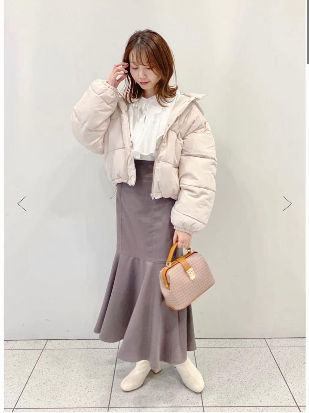 ⬛︎モデル 157㎝ カジュアルになりやすいダウンコートをマーメイドスカートで女性らしく。 ワントーンで合わせて柔らかい印象にしています。 暖かさバッチリなので、コレからの1月、2月のコーデとしても参考になるコーディネートです!