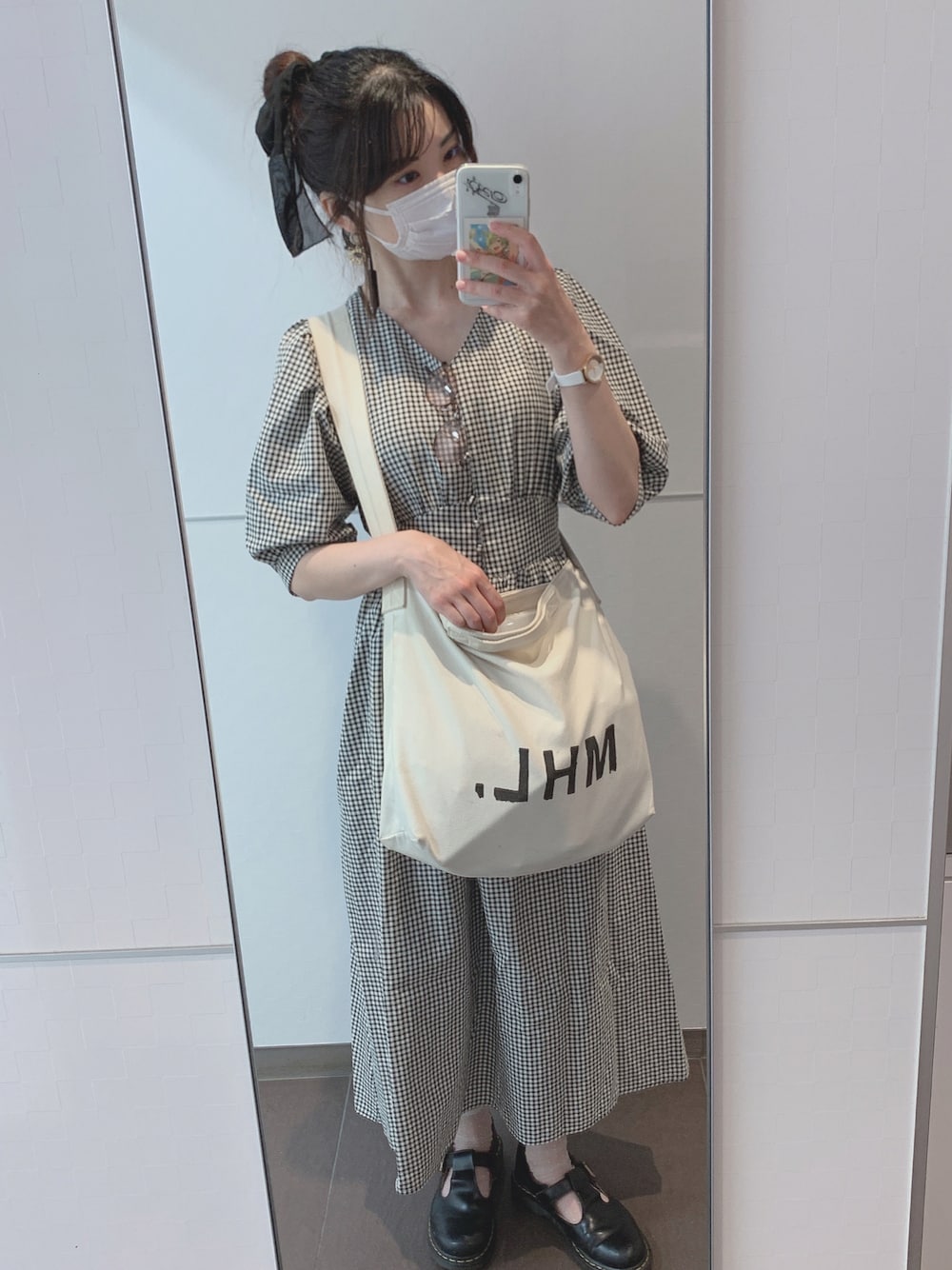 ギンガムチェックのワンピース🌷 ウエストが絞られてるので細く見える!👏🏻 久しぶりにお団子してリボンなんて結んじゃいました🎀