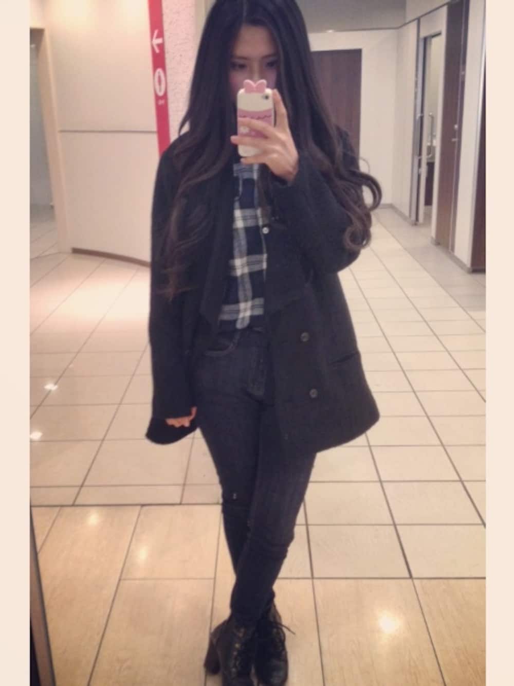 タータンチェックをきたくて ブルーのシャツと黒のコートでカジュアルにきてみました♪ボトムスはもちろんジーンズで👖💓