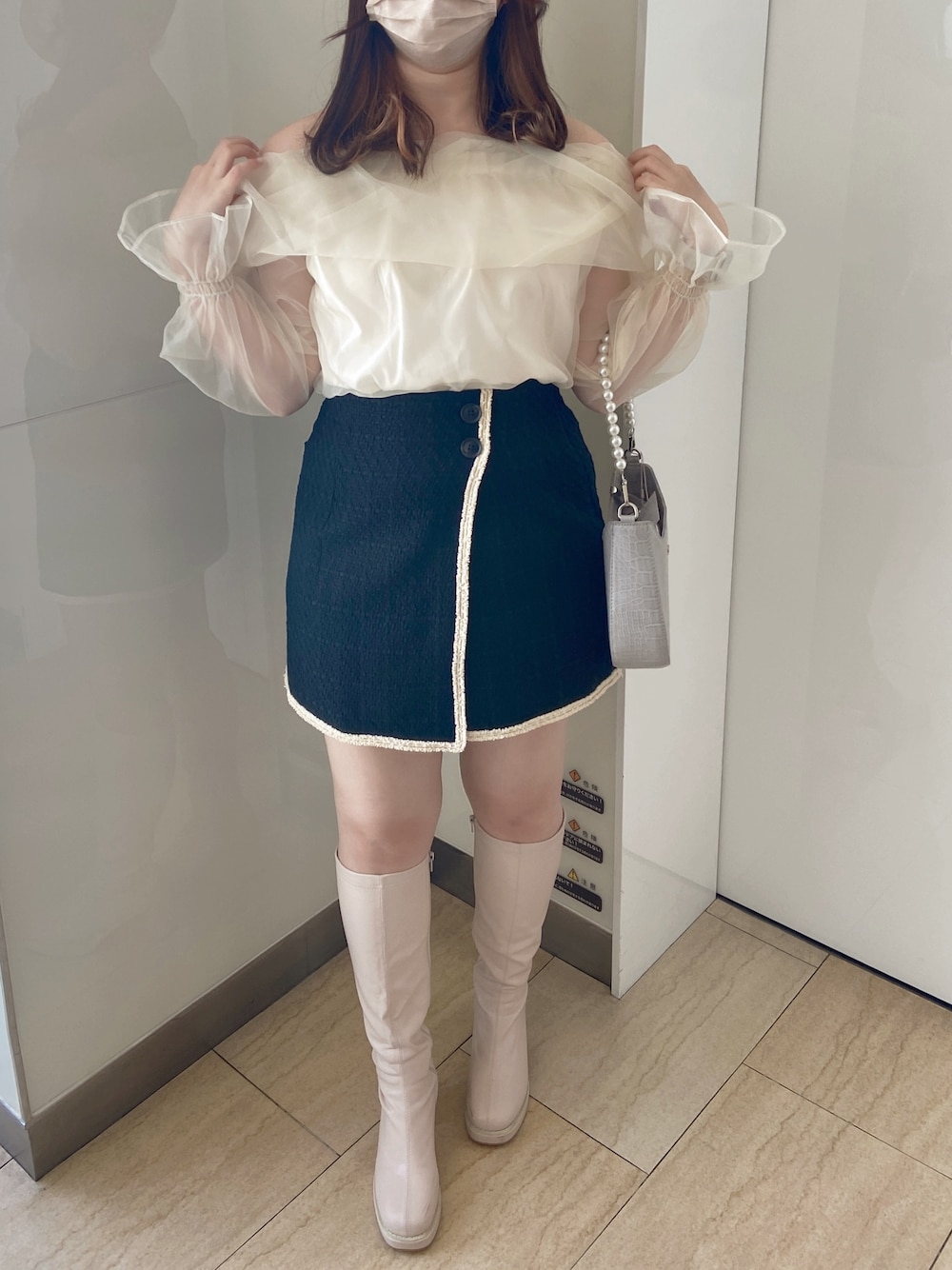 身長157cm 細くないので体型が気になる方の 参考になれば嬉しいです♡ トップス ご予約で大人気のトップス!!! シアー感とオフショルが他にはない トップスなので人と被らないです!! 肩幅ごつくて、着れるか心配でしたが 着てみたら可愛かったです🥹🥹 きついところがなくて、ゴムが入ってるので らくちんです🙆♀️ スカート このスカートインナーついてるので、中に 履かなくてもいけます👍🏻 ウエストが割と緩めなので私のようなぽっこり お腹さんでも余裕で履けました!!!