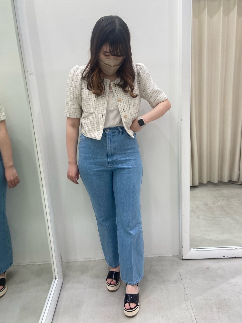 身長157cm 足のサイズ23.0 骨格ストレート 【ジャケット】フリーサイズ 店頭でも大人気のツイードジャケット! 春ツイードがトレンドなのでこれを 着るだけで凄くオシャレに見えます✨️ 私は中にレースインナーやカップ付きのキャミを 着て前を開けて着るのがおすすめです!! 二の腕が太い私でも腕はすんなり入るし() ちゃんと動きやすいです👍🏻👍🏻 【デニム】Mサイズ着用 このデニム履けました〜!!!買いました! むちむちなの分かってますが、履けたので OKです!!!笑笑 私はMサイズで丈ばっちりなんですが、 ウエストの1番細い部分が高い位置にあって そこに合わせて履いてるので細身の方で身長157cmならSサイズでも丈は大丈夫です!! 店頭で156cmの方がSサイズ試着してそのまま買ってくださったので間違いないです👍🏻👍🏻 ウエストやお尻が気になる方はMサイズをおすすめします! 【サンダル】Sサイズ着用 横幅広めかな?と思ったので幅広の方にも おすすめです。足のサイズ23.0ならSサイズで いいかなと思います!!
