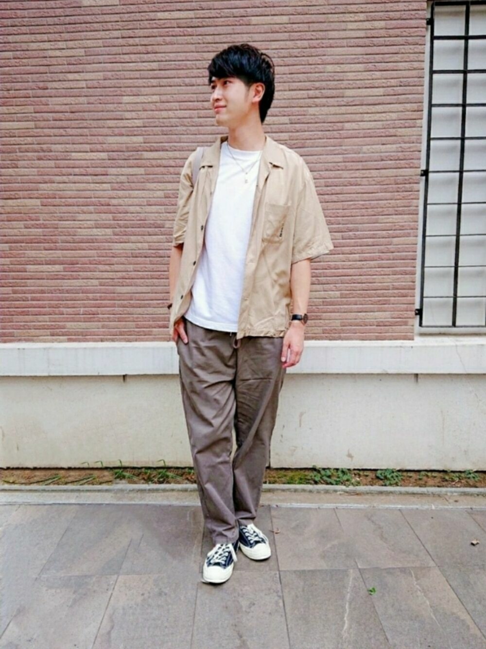 いつもご覧いただきありがとうございますm(._.)m まだまだ暑い日が続きますが色味だけでも秋っぽくしようと思いコーディネートに反映させました😄💡 ざっくり言うとオープンカラーシャツにシェフパンツなので春の装いですがベージュやカーキのアースカラーで秋の装いに👕 オープンカラーシャツは去年のGU×SOPHコラボのシャツでレーヨン素材でツヤ感があり涼しい着心地ですが洗濯するとシワになるので着用前はアイロン必須です…😅 このコーディネートが少しでもいいねと思ったら♥️マークを🙋⭕ お気に入り登録や、フォロー追加、フォルダイン等々モチベーションになるますのでよろしくお願いします(^^) ゆっきーさん、たっくんさん、RA★SEさんフォルダインありがとうございます😉👍🎶 最後までご覧いただきありがとうございました~m(._.)m