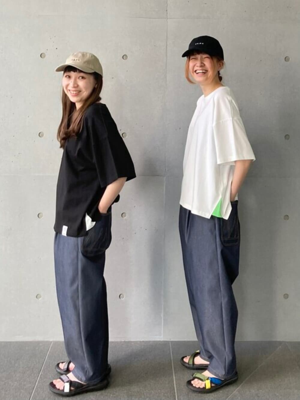 PARKシリーズの夏の新作から、シンプルなTシャツを身長別で着ました。 151cm/0サイズ、162cm/1サイズでそれぞれ着用しています。 身幅や肩幅はゆったりと、着丈は慎重に合わせてジャストで着られるよう設計されたTシャツは、サイドからチラッと見える三角形がポイント。 夏に1枚で着てもサマになる嬉しいアイテムです。