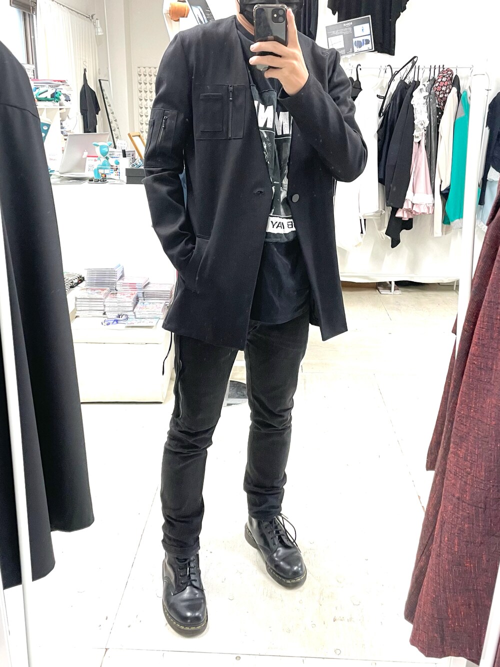 ラモーンズのリメイクTシャツに細身のジャケット、スキニー、Dr.Martinとロックモードなスタイル