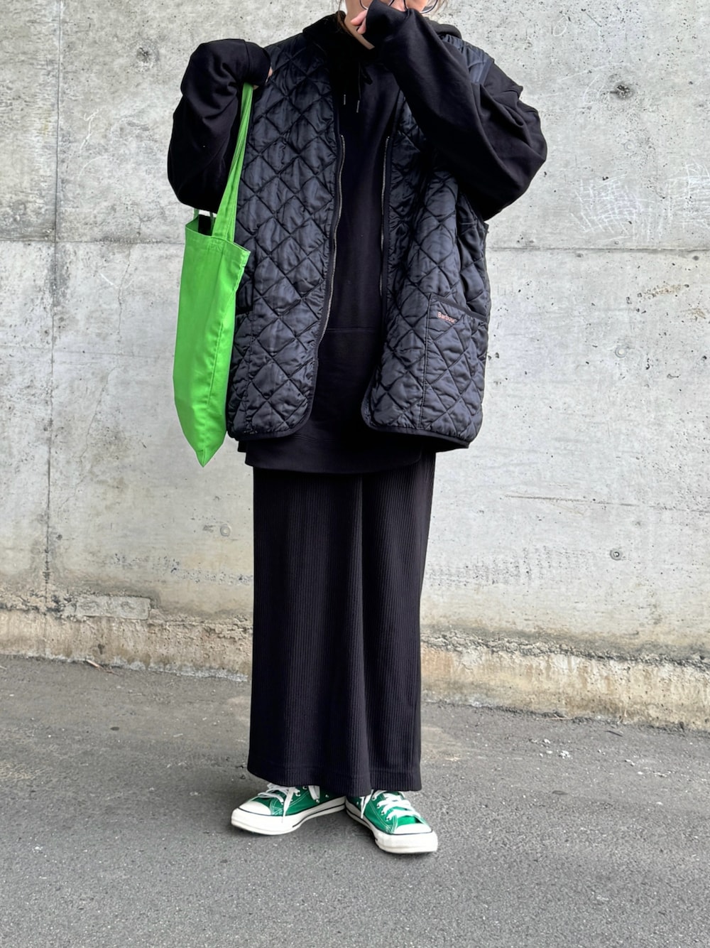 異素材を使ってオールブラックコーデ🐦⬛ 差し色にグリーン投入!🦖🦖 ゆるだぼシルエットがお気に入りです🫶 ┈┈┈┈┈┈┈┈┈┈┈┈┈┈┈┈┈┈┈┈ 見て頂きありがとうございますฅ( ꕕ ټ ꕕ )ฅ