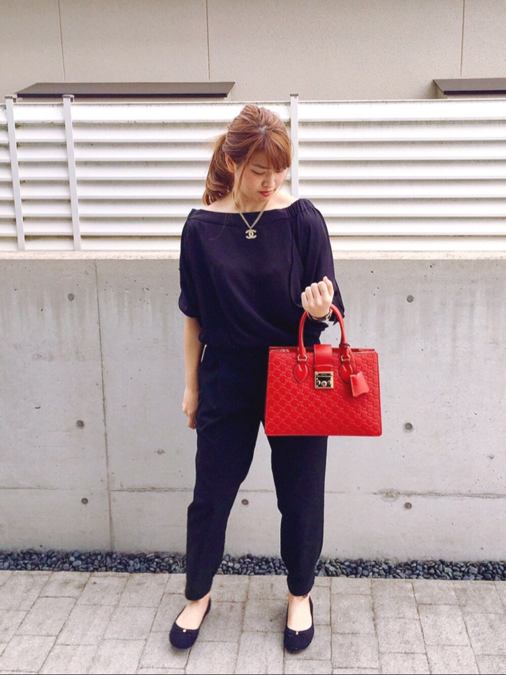 🌈全身黒コーデ オフショルダーでセクシーに。 赤いカバンをワンポイントに。 いいね & save & フォロー して頂きありがとうございます🌼