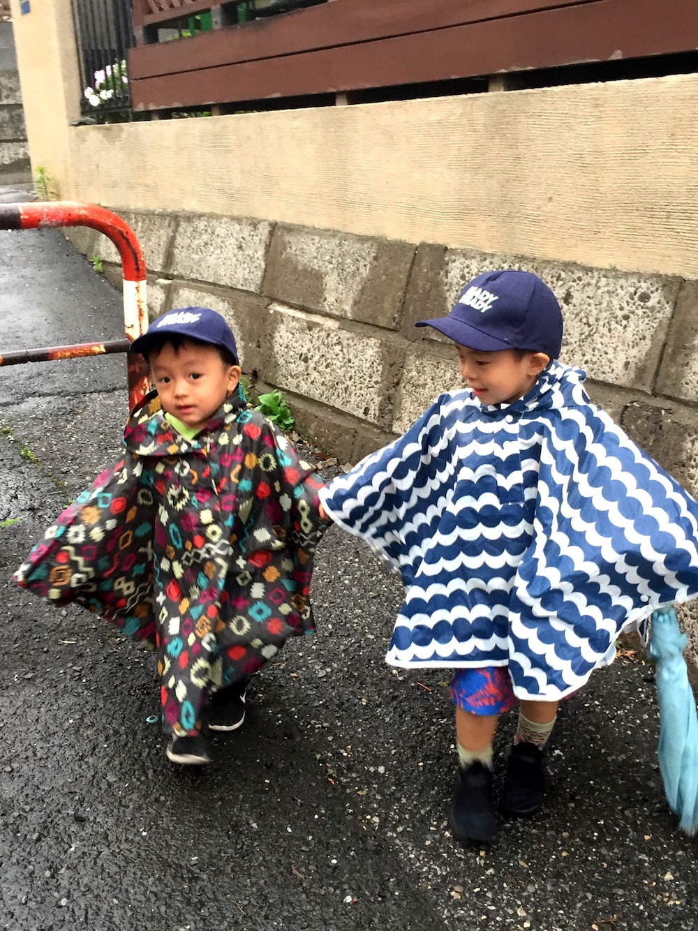 降園時 雨降り時はポンチョきて、お手手仲良く繋いで帰宅〜 kiuというブランドのポンチョはアウトレットで、購入!