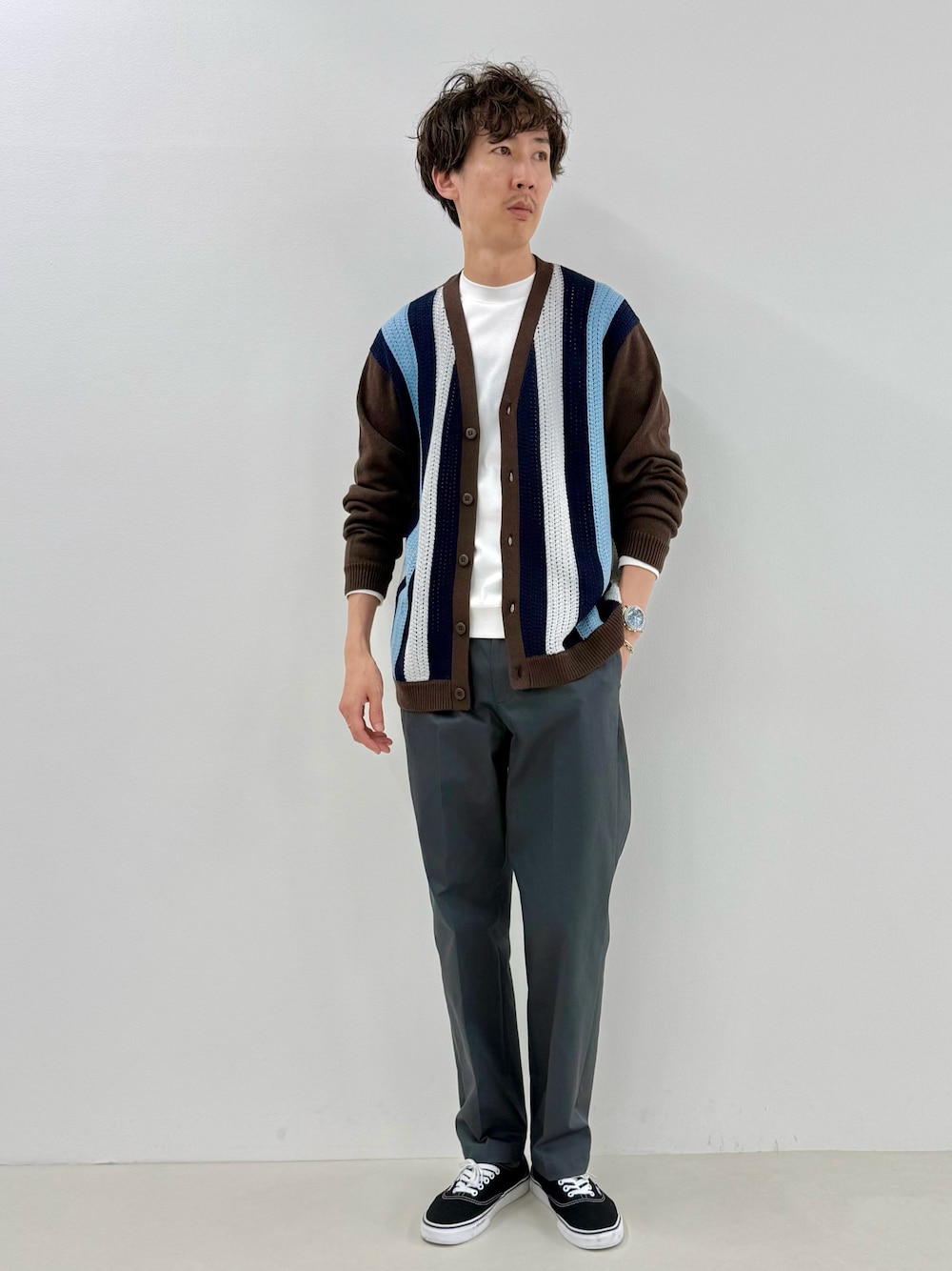 Nicolas Tanaka(Nolley's goodman)のカーディガン/ボレロ「フロントストライプ 7Gカーディガン/ウォッシャブル/抗菌加工」を使ったコーディネート