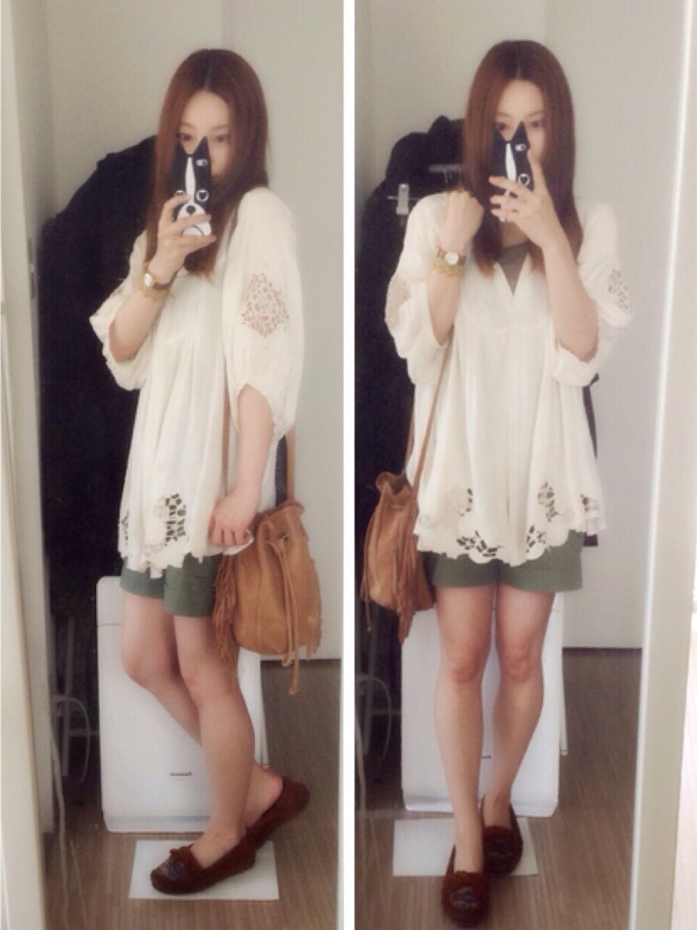 ふんわりブラウス、腕の刺繍が綺麗で大好き♪ とっても涼しいです。 ブラウス:nano・universe タンクトップ:GLOBALWORK ショーパン:NATURAL BEAUTY BASIC バッグ:TRES シューズ:MINNETONKA