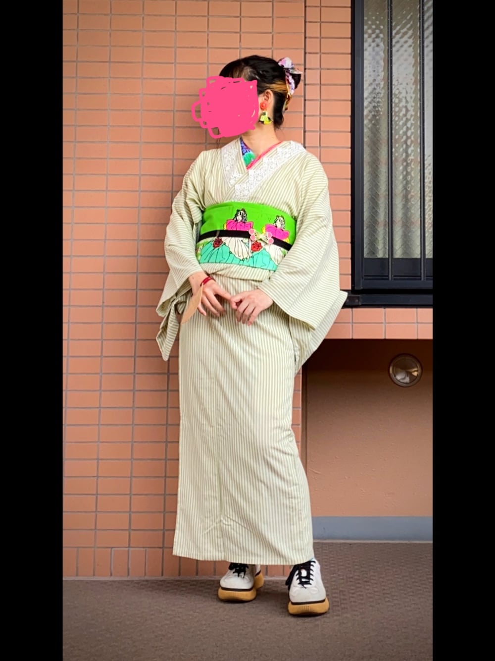 洗える着物っていいなと買ったものの、Sサイズなのに幅広く丈長くて着なかった単を着てみた日。 わかっちゃいたけど着にくい。 ので、先日頂いたかわいい帯を締めてみた、! かわいい!!!(帯が)