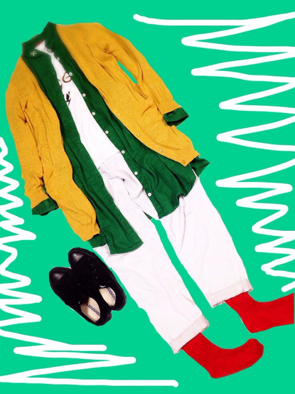 黄・緑・赤 信号機! カーディガン…niko and Tシャツ…UNIQLO パンツ…フェリシモ 靴…converse