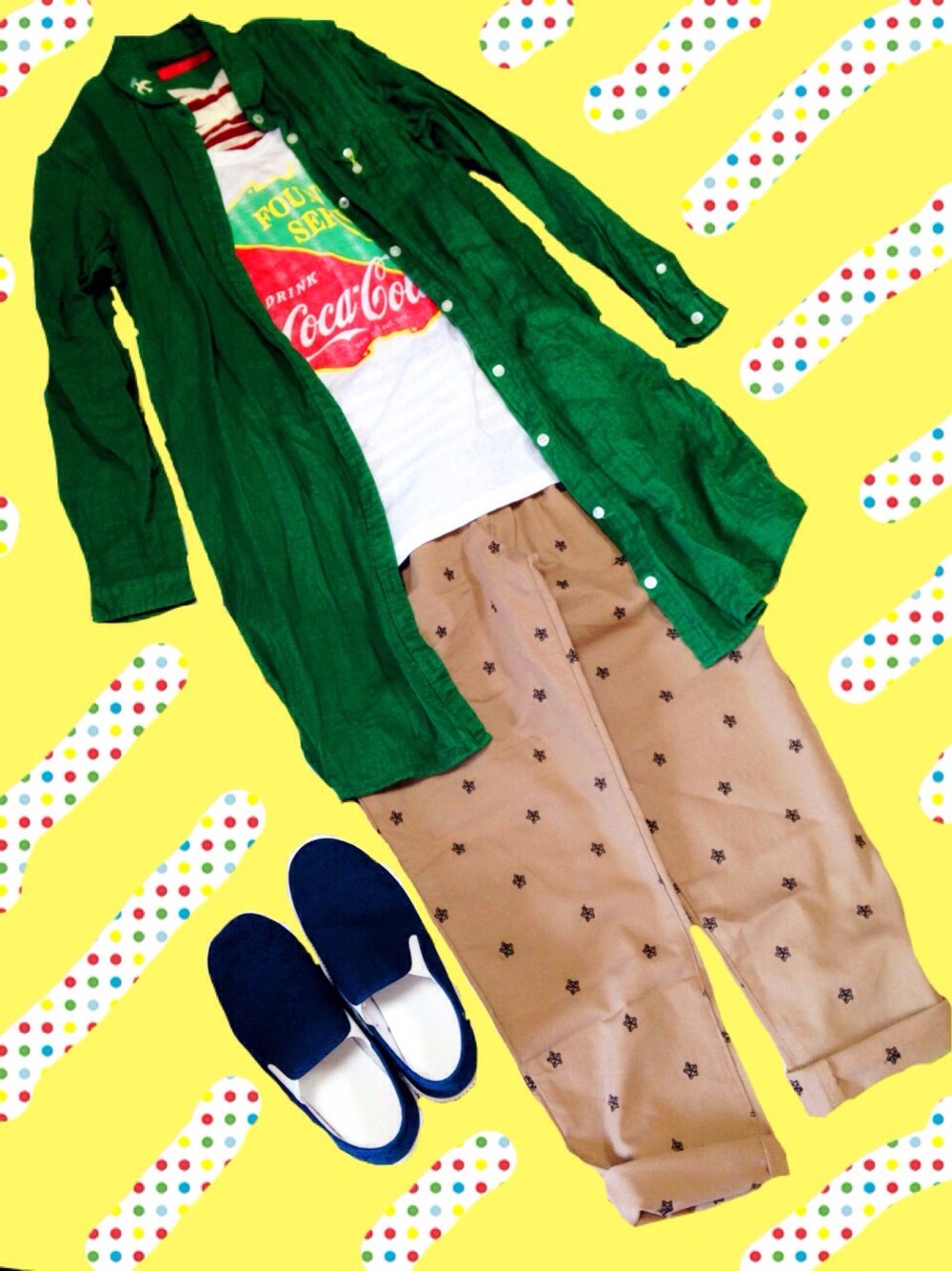 コカコーラシャツはユニクロさんで500円でした。 でも本当は母がこのシャツ着てしまったので違うユニクロさんの白Tを着ました。 そしてこのパンツ星柄… ではなくオクラ柄です笑 コカコーラしゃつ…UNIQLO しましましゃつ…? オクラぱんつ…フェリシモ