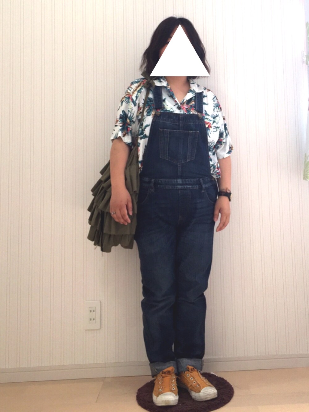 こんばんは✨ 今日は、息子をお迎えに行って帰宅した直後に豪雨☔ 結構長い時間降っていてビックリ! 買い物しないで帰って良かったわε-(´∀`*)ホッ 今日のコーデ。 今日はnikoのアロハ~なシャツが着たくて、GAPのオーバーオールを合わせました。 シャツはてろ~ん具合がいいです😃 オーバーオール合わせで、あまり分量が見えすぎないから会社にも着ていけるかな?と思ったけど、夏な感じのコーデになりました🌺 バッグはキャセリーニのカーキのフリフリ。 形は甘いけど、カーキなので甘くなりすぎないところが好きです❤ 今日も息子の寝かしつけで寝落ちしてから起きたから眠い😴