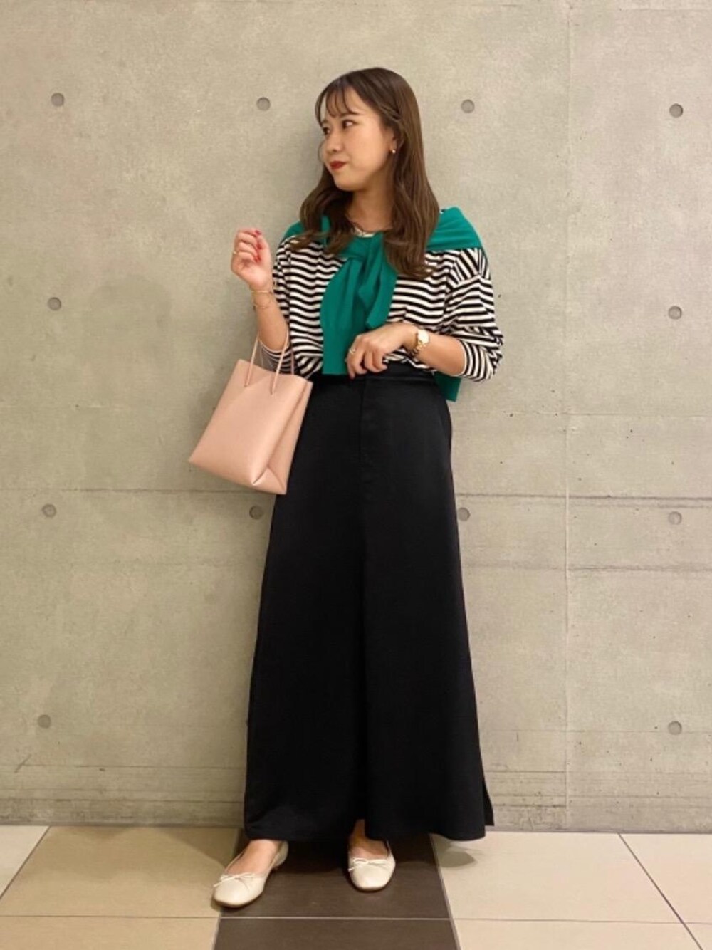 (年齢)20代前半 (身長)158cm (普段サイズ)トップス38/ボトムス38/シューズ24.0cm (サイズ感) トップス:ややゆったりめ スカート:標準 シューズ:標準 (生地感) トップス:薄手 スカート:しっかりめだが軽さあり (コーディネートポイント) 袖が少しボリューミーで、首元も程よく開きのある女性らしいボーダートップスに、やや光沢感のあるネイビーのスカートを合わせキレイめカジュアルコーデにしました。差し色に緑のカーディガンを合わせました。