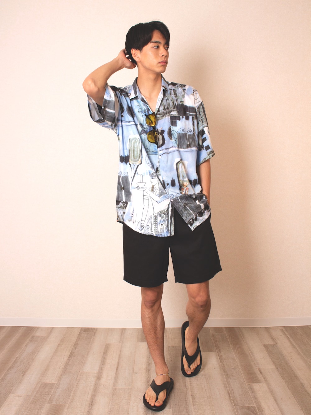 目を引くアロハシャツには シンプルに黒い小物が合わせやすいです! テロンとした生地のアロハシャツなので 真夏も涼しく着られると思います♪