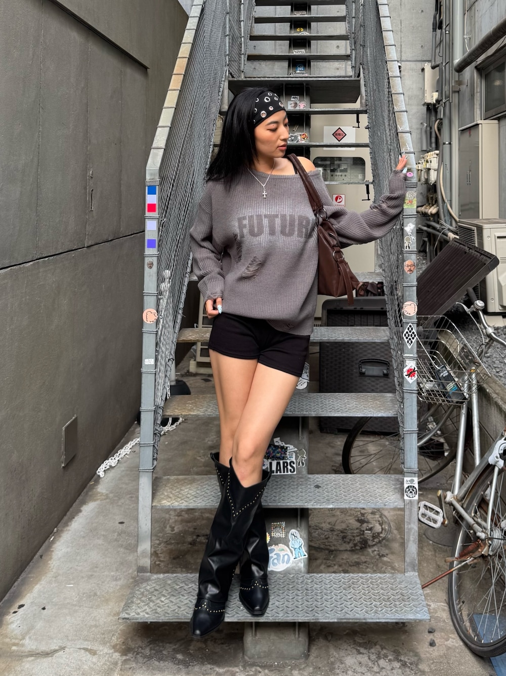 niinain(WHO'S WHO gallery ルミネエスト新宿店)のニット/セーター「ダメージスプレーロゴニット」を使ったコーディネート