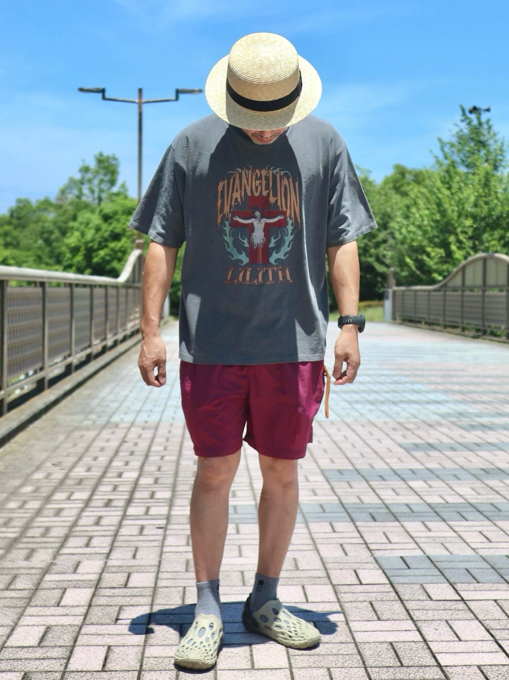 ぼんじりのTシャツ/カットソー「【EVANGELION】別注 エヴァンゲリオン ヴィンテージ加工 グラフィック刺繍 オーバーサイズ半袖Tシャツ」を使ったコーディネート