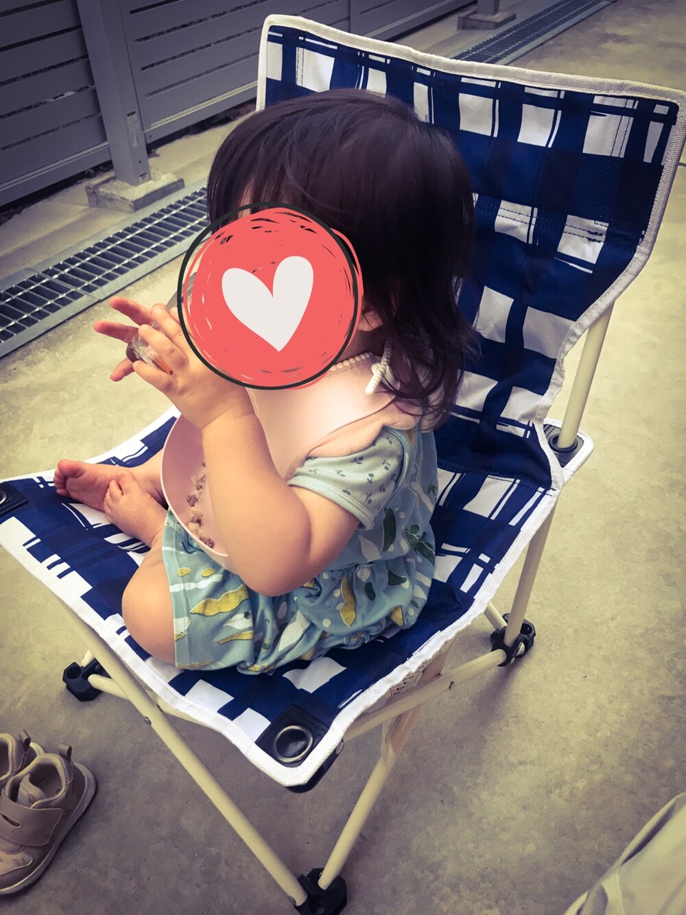 今日は暑かったので、夕方はお庭でご飯を食べてご満悦な我が子です😃ワンピースはえんどう豆柄です。