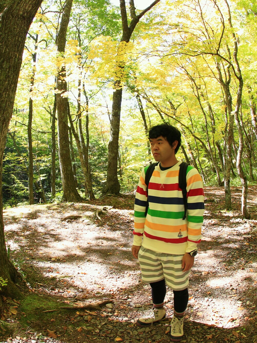 レンズがフィッシュアイなので歪んでますm(__)m 紅葉の中撮ったので黄色被りです。 白は真っ白です。 渓流の川沿いで撮影したのでボーダーのスウェットを着ようと思い着てパンツは…と悩んだ結果ボーダー合わせです(笑)