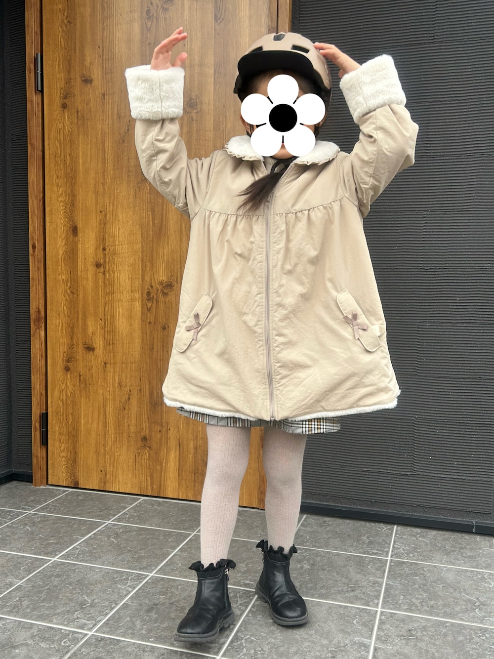 アウターが軒並みにサイズアウトしたので奮発して新しいコートを購入しました。 大きめサイズを買ったら、コートワンピみたいになってらとっても可愛いです🧸🩷