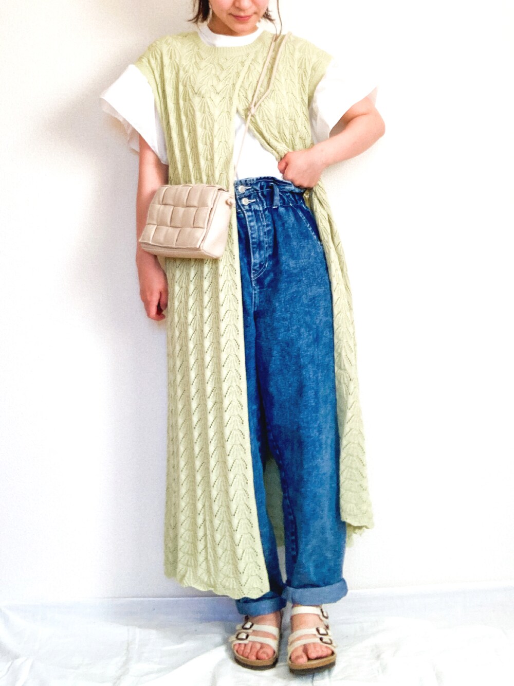 綺麗め透かし編みニットもデニムを合わせるとカジュアルに落ち着く。 表示してるの以外はしまむらで。