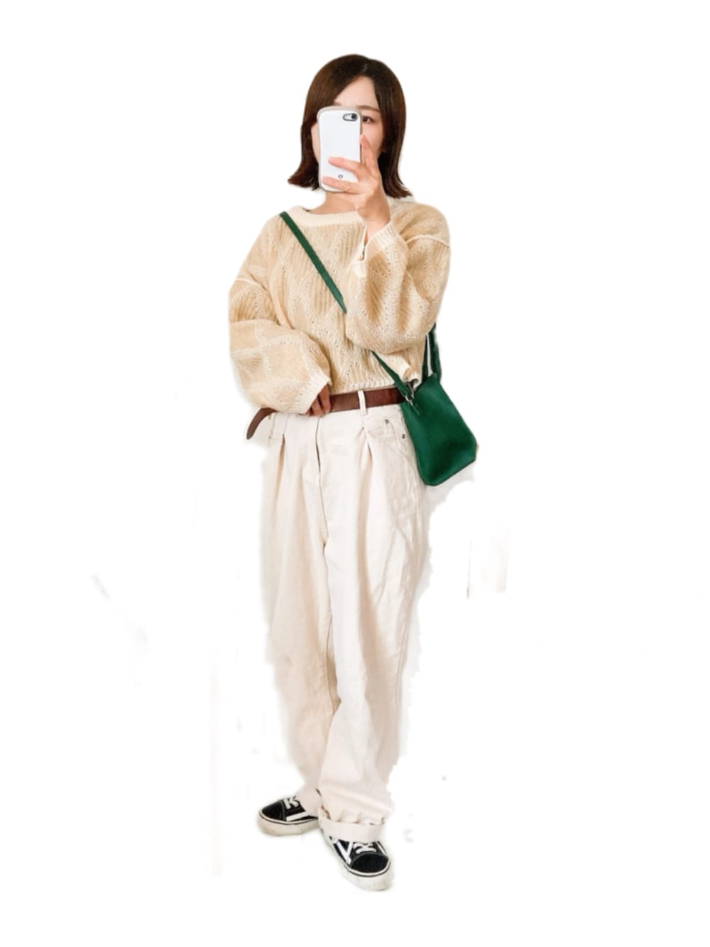 ホワイト系のその他パンツを着用したレディースの秋コーディネートの1枚目の写真