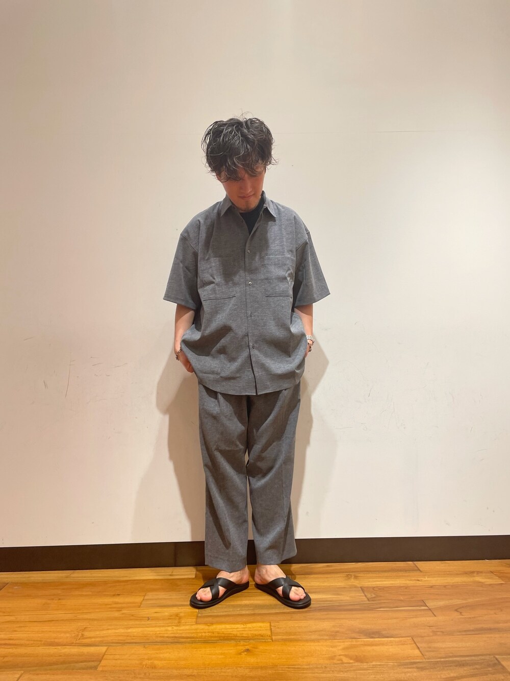 アーバンリサーチの新作のセットアップのコーディネート 肌離れが良い生地なので、真夏まで着て頂けます。 足元はサンダルでぬけ感を