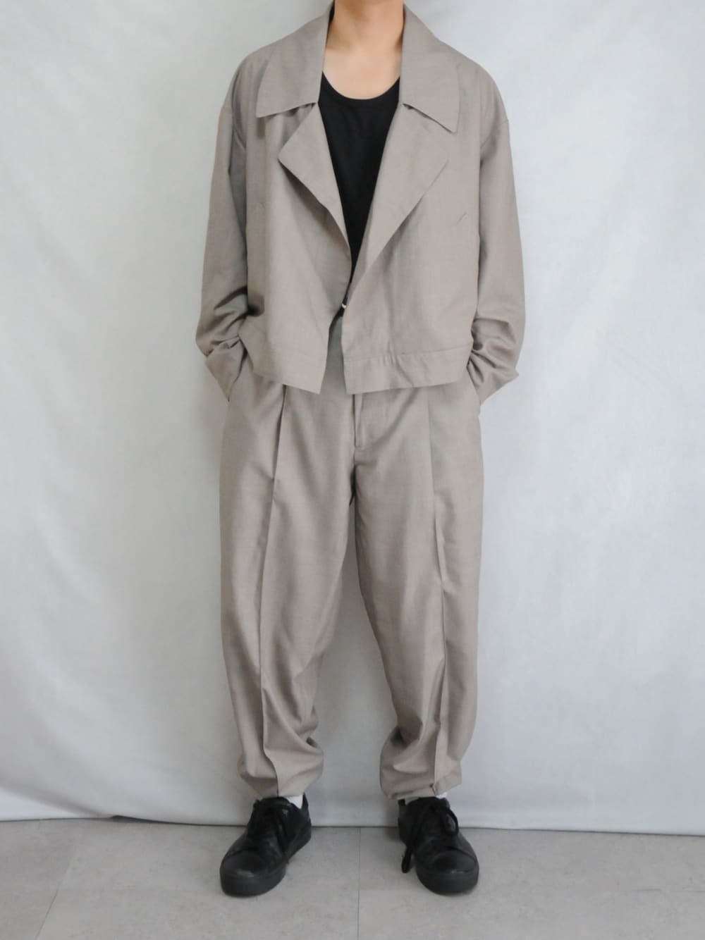 依然大ヒットを続けているワイドバルーンパンツ【品番:nw182186】とセットアップで使えるジャケゾンが登場。 インパクトのある大きめなラペルに、フロントはボタンレスでスッキリと仕上げています。 トレンドのワイドスリーブに綺麗なカーブを描くよう計算された腕周りのシルエットは、何度もやり直しをかけてとことん納得いくまでこだわった部分です。 白糸を織り混ぜて高見えする表情にこだわるなど、試行錯誤の末に完成したオリジナルのTR素材は継続。自然なドレープ感のある大人らしい印象に。 それぞれ単品でももちろん使えますが、是非セットアップで挑戦して欲しい1着です。