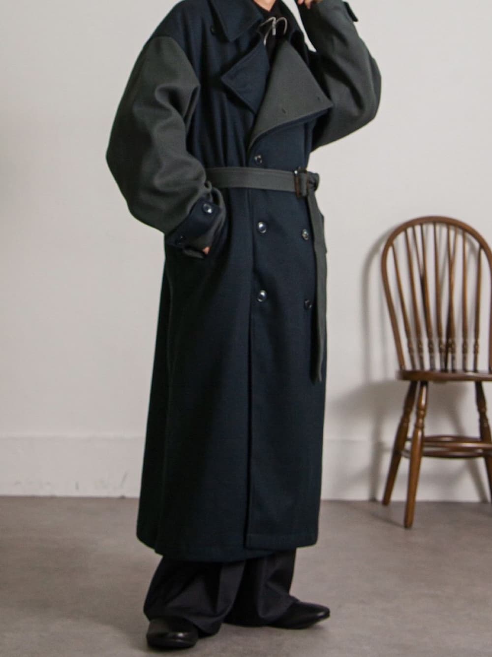 ------------------------------------------------------ Instagramにて新着情報更新しております。 ↓ @nilway_official ------------------------------------------------------ 今期春秋大人気だった配色トレンチコートをウールテック素材を使用し秋冬仕様で登場◎ 随所のバイカラー使いが特徴的なトレンチコート。 首元のチンストラップをボタンで留めることで、スタンドネックのような着こなしも可能。 二重になった配色の襟もデザイン性があり差別化された1着◎ 袖部分やポケット部分をカラー切替しており、フォーマルな印象を持たせながら、遊び心の効いたアイテムになっています。 配色は 合わせやすいBLACK×CHARCOAL アンニュイな雰囲気のBLACK×KHAKI 今期トレンドのNAVYを取り入れたNAVY×CHARCOALの3色展開となっております。 トレンドのハーフジップやシャギーニット、ワイドパンツ等のコーディネートが今期らしくおすすめです◎ 今期の秋冬大活躍の1着です!