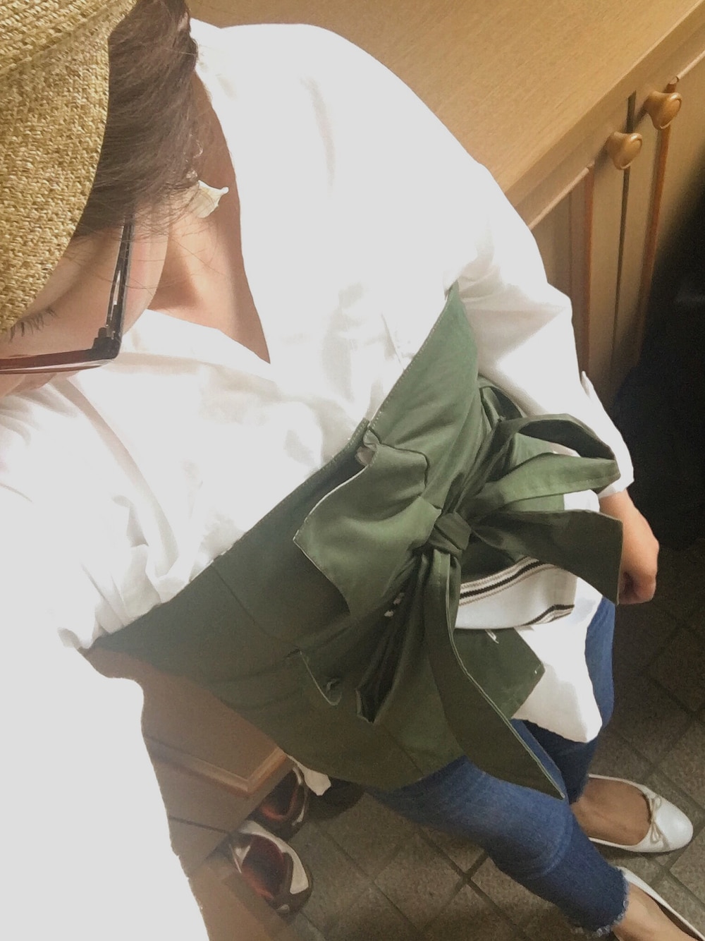 グリーン系のチューブトップ、ブルー系のデニムパンツを着用したレディースの春コーディネートの1枚目の写真