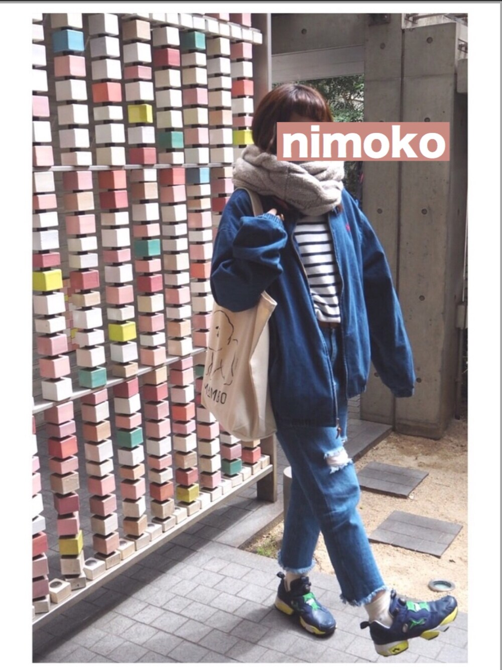 まだまだ寒いからスヌード手放せない〜〜 デニムオンデニムのコーディネートだいすき。 靴下かわいいからお気に入り🌟 トートバッグもかわいいわんこ🐶! 撮影 : さきちゃん