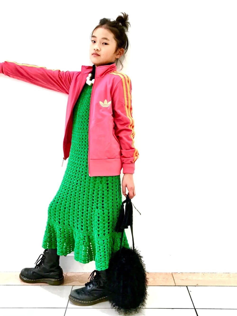 見てくださり うれしいです。 グリーン✖️ピンク➕ブラック。 かぎ編みのワンピース👗に adidasのピンクジャージ。 2つとも 390円👍 usedならではの ワンピ❤️ 裾の ひらひら感も可愛い💕 ふさふさバックは、先月の母の誕生日に頂いたバックです❣️ 可愛い❤️❤️