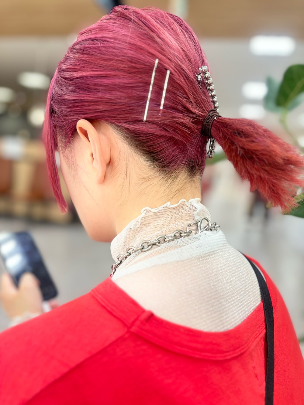 髪色変えました✂️ 途中段階載せてます🟣 シア-素材に真っ赤なワンピース❤️ 派手かなぁ〜⁈ これで学校行ってるから大丈夫🙆