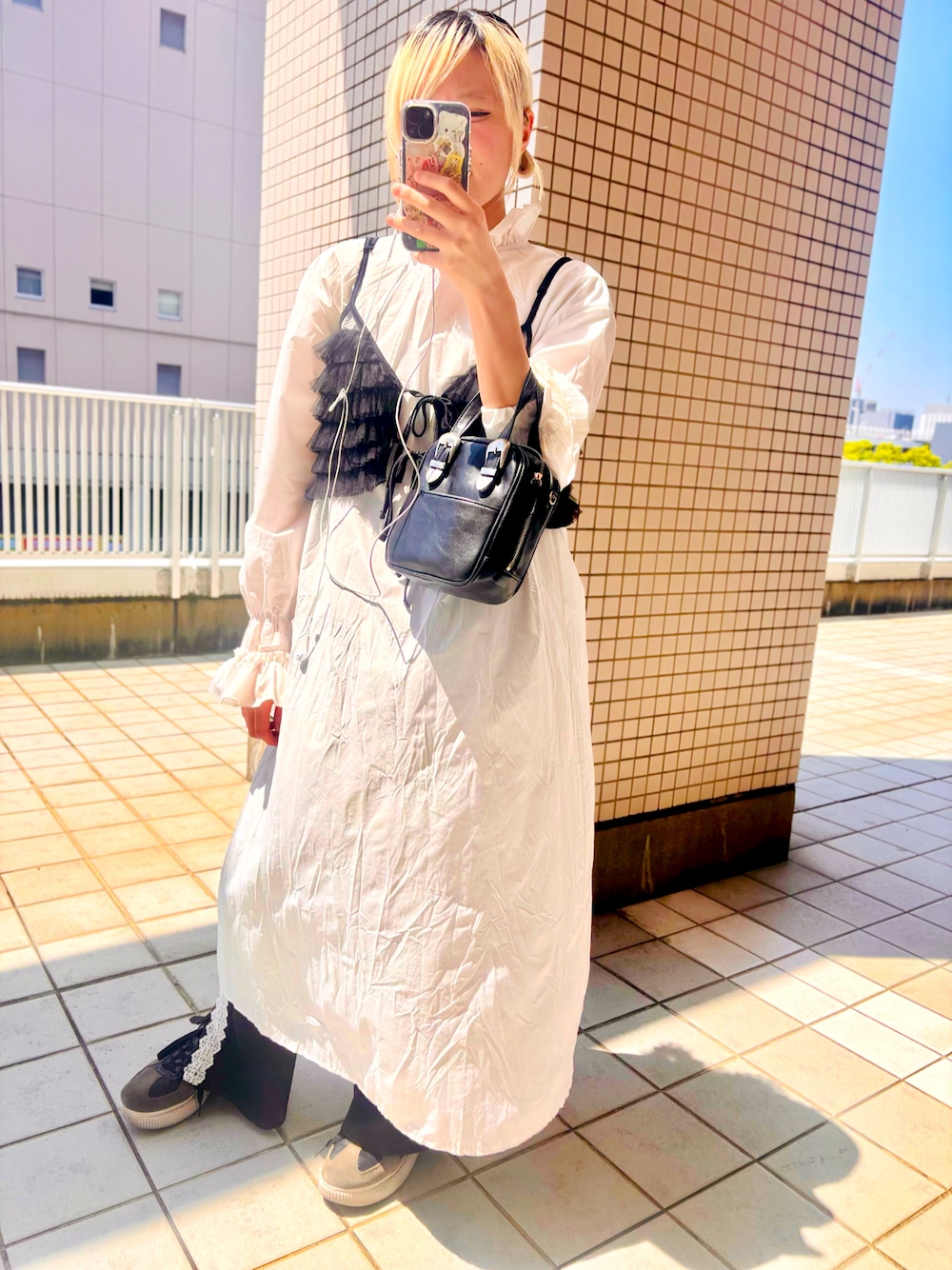 見てくださり、ありがとうございます😊 白ワンピースにチュ-ルビスチェ🖤🤍🖤 花ラインパン合わせ。