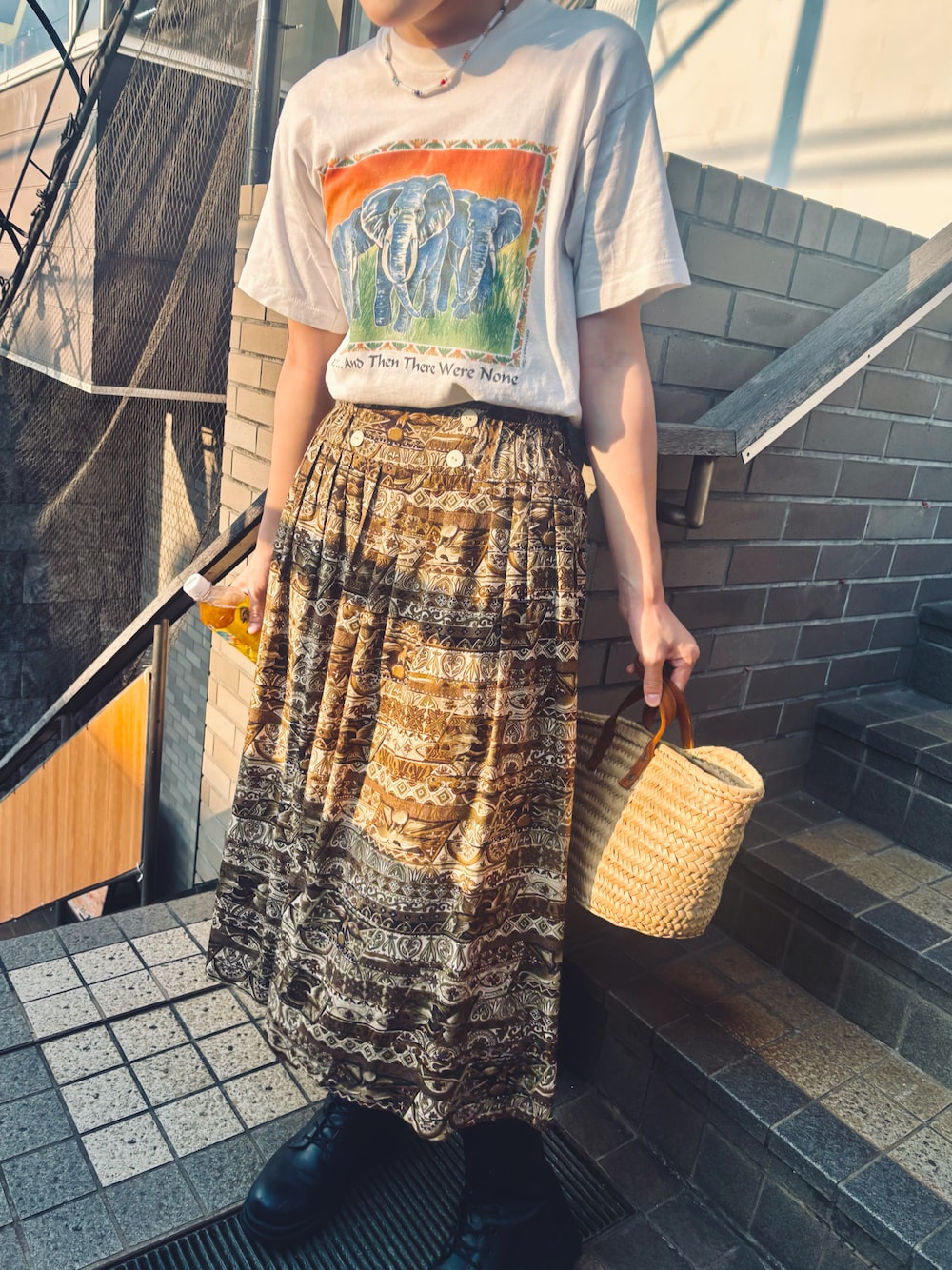 見てくださり、ありがとうございます♪♪♪ 髪 切りました✂️ 象🐘柄がかわいいTシャツに、スカ-ト合わせ。 上下とも古着🫶🏻 スカ-ト、色も柄も ボタンも なんとも言えない可愛さ😆 かごバックとブ-ツ❤️