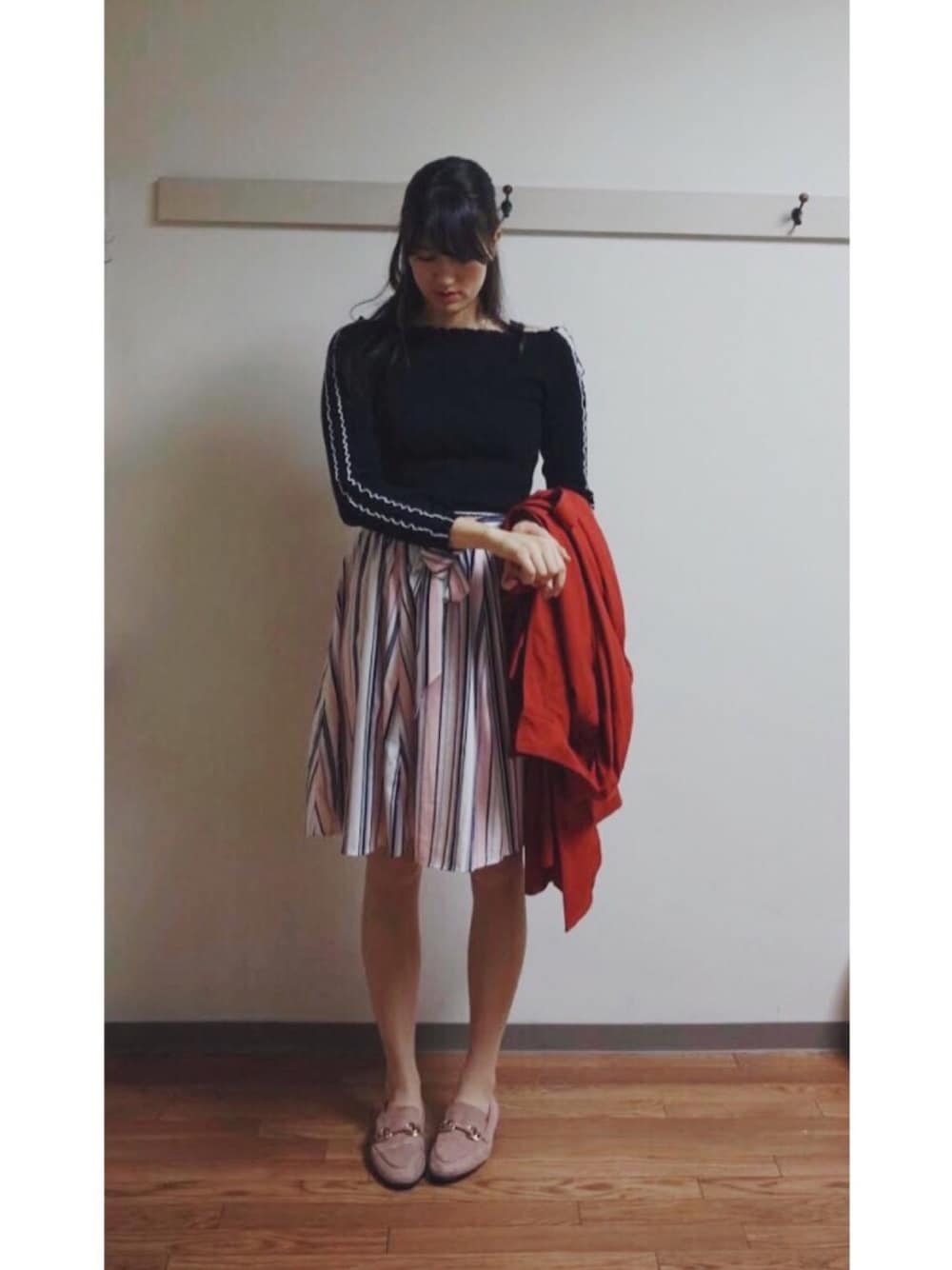 ご覧いただきありがとうございます😊 いつもいいね、SAVEやコメントも本当に嬉しいです。感謝です🧡 今日のコーデはきれい目です。 このZARAのトップスの首回りのデザインと袖に入っているストライプが可愛くて惹かれました💖 スカートとローファーはどっちもピンク系です! ではでは 👋💕