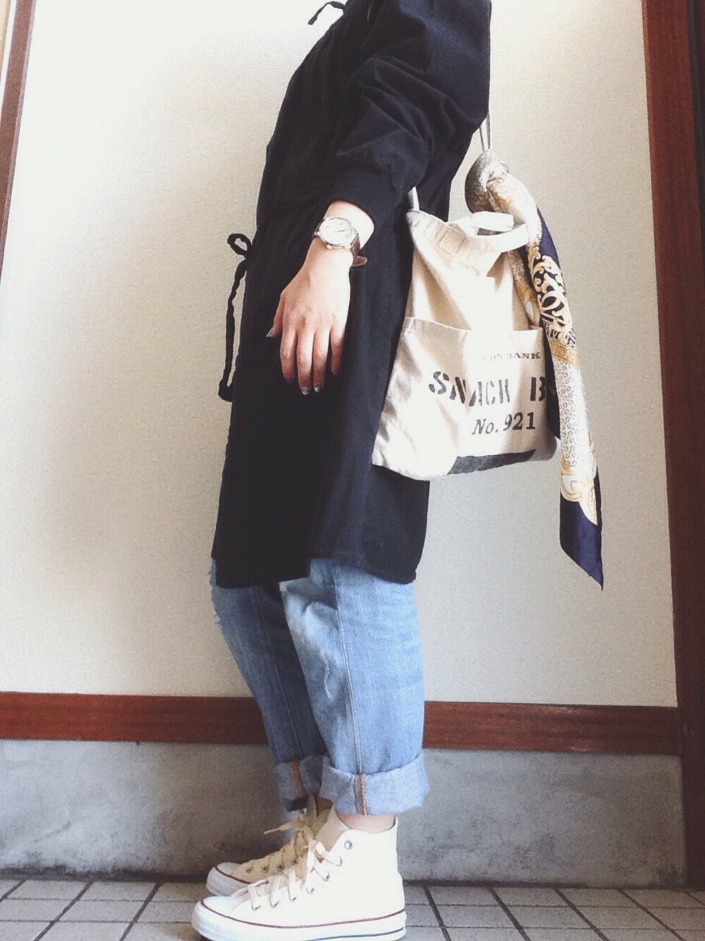 羽織でも使えそうな不思議な形のワンピ。 素材や袖の詰まり具合がツボ。 靴は黒の方がよかったかなぁ?首にスカーフ巻けばよかったかなぁ?まだ着方の正解を模索中…