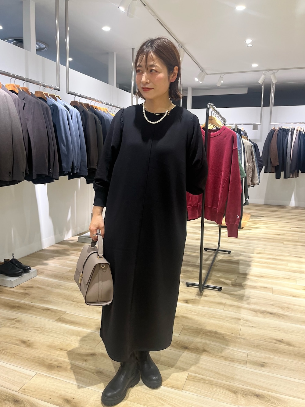 素材はストレッチの効いたダンボールニット素材のワンピース。型がとてもきれいなので アクセサリーをプラスして、お食事会やおでかけにおすすめ。袖の部分が異素材になっているのもポイントです!