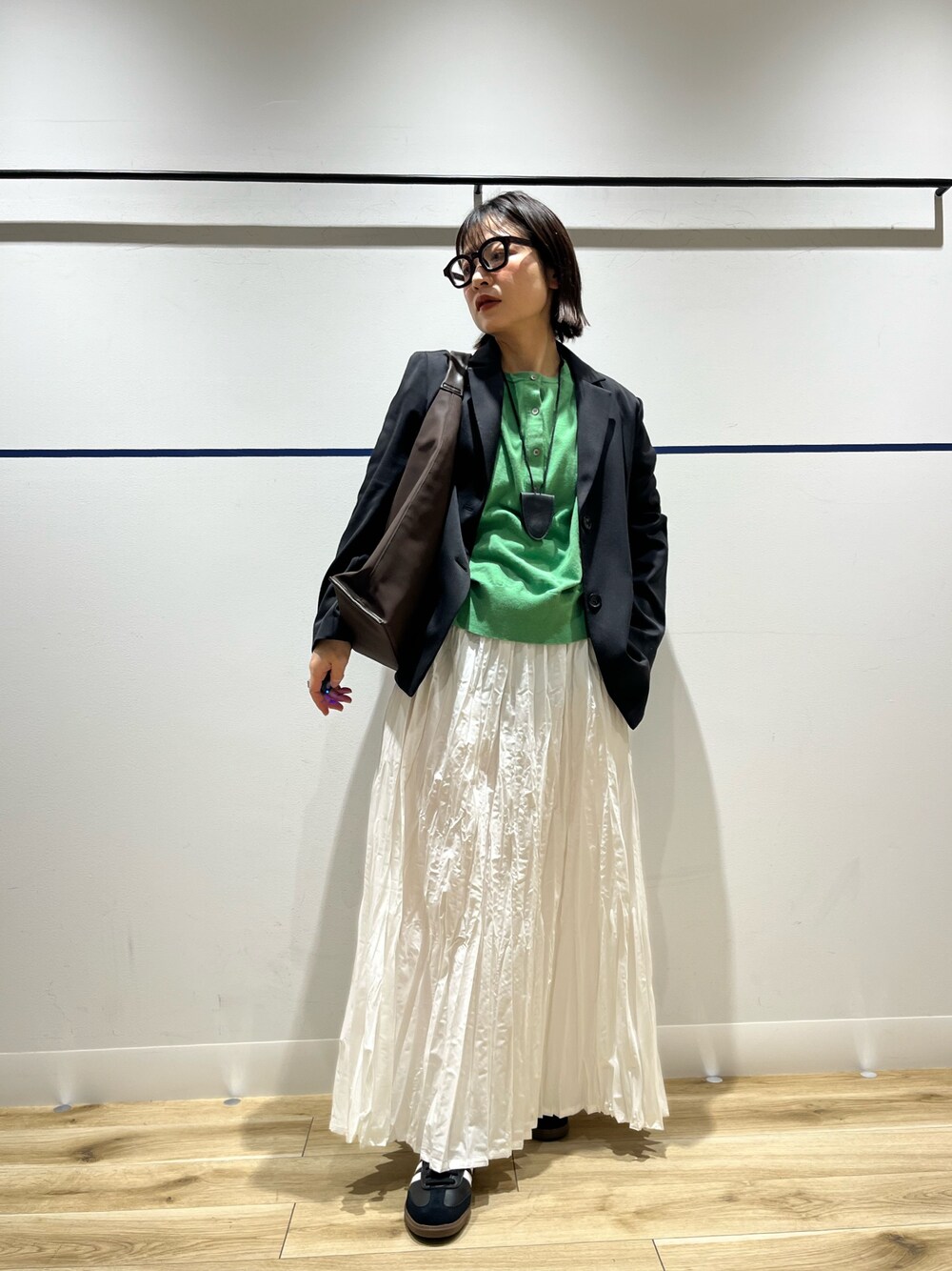 ご覧頂きありがとうございます! DOORSのテーラードジャケットです。 割とコンパクトな作りになっており シンプルなデザインです。 今回は、カジュアルな着こなしに してみましたが、オケージョンや オフィスでも活躍しそうなアイテム。 ジャケットのインナーら差し色に かぐれのコットンカシミヤヘンリーネックニットを使用しました。 ボトムスはかぐれのコットンクリンクルスカートを履いて、春を演出したコーディネートです。