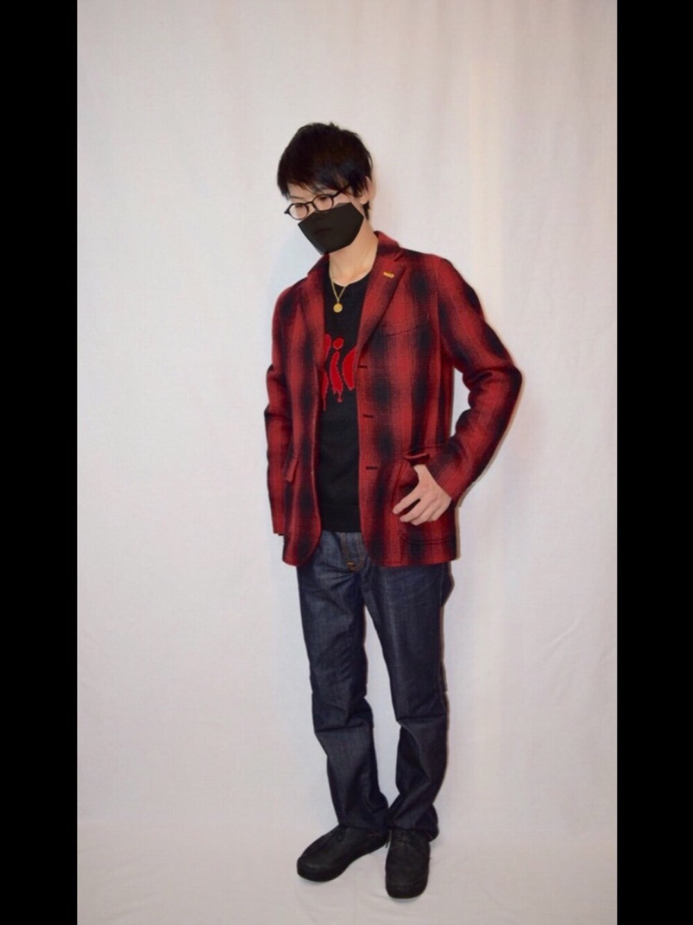 2トーンで作る事が好きで、これは赤と黒のトーン。 ゆったりとかっちりの合わさった感じが好きです。