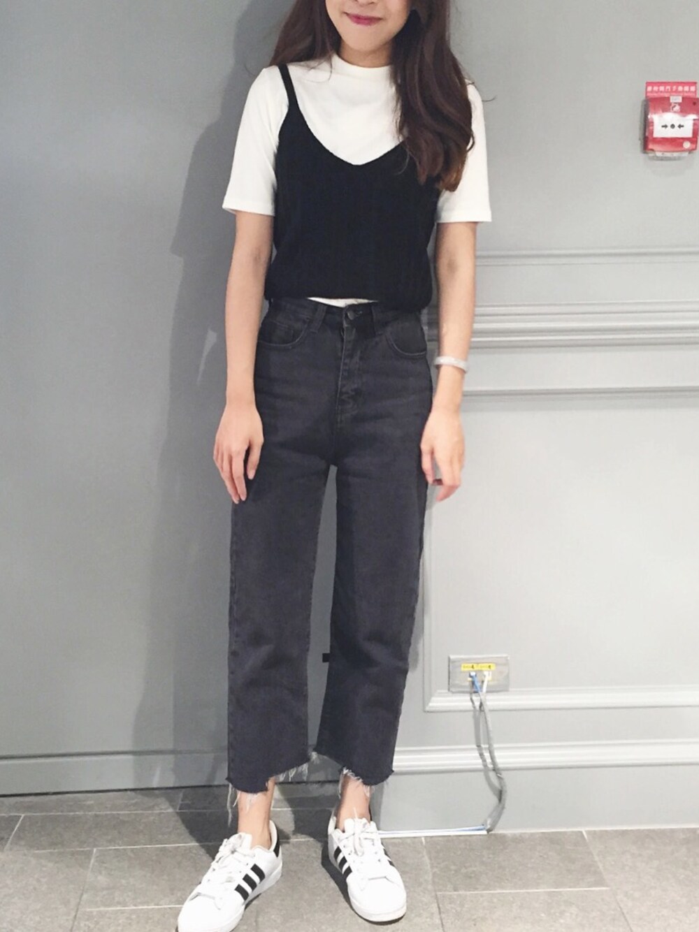 ホワイト系のスニーカーを着用したレディースの秋コーディネートの1枚目の写真