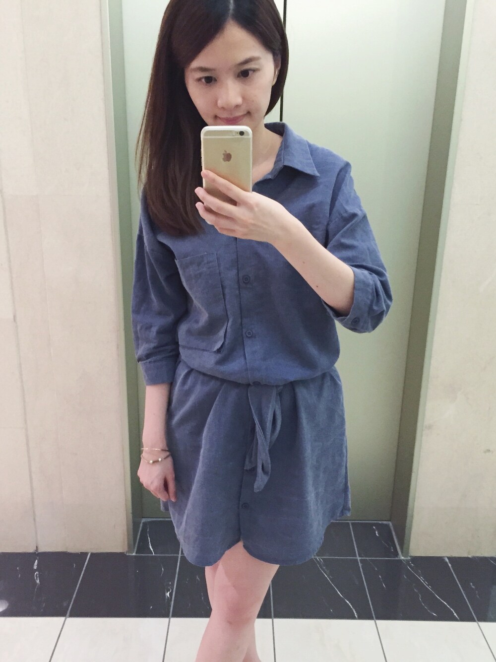 ブルー系のワンピースを着用したレディースの秋コーディネートの1枚目の写真